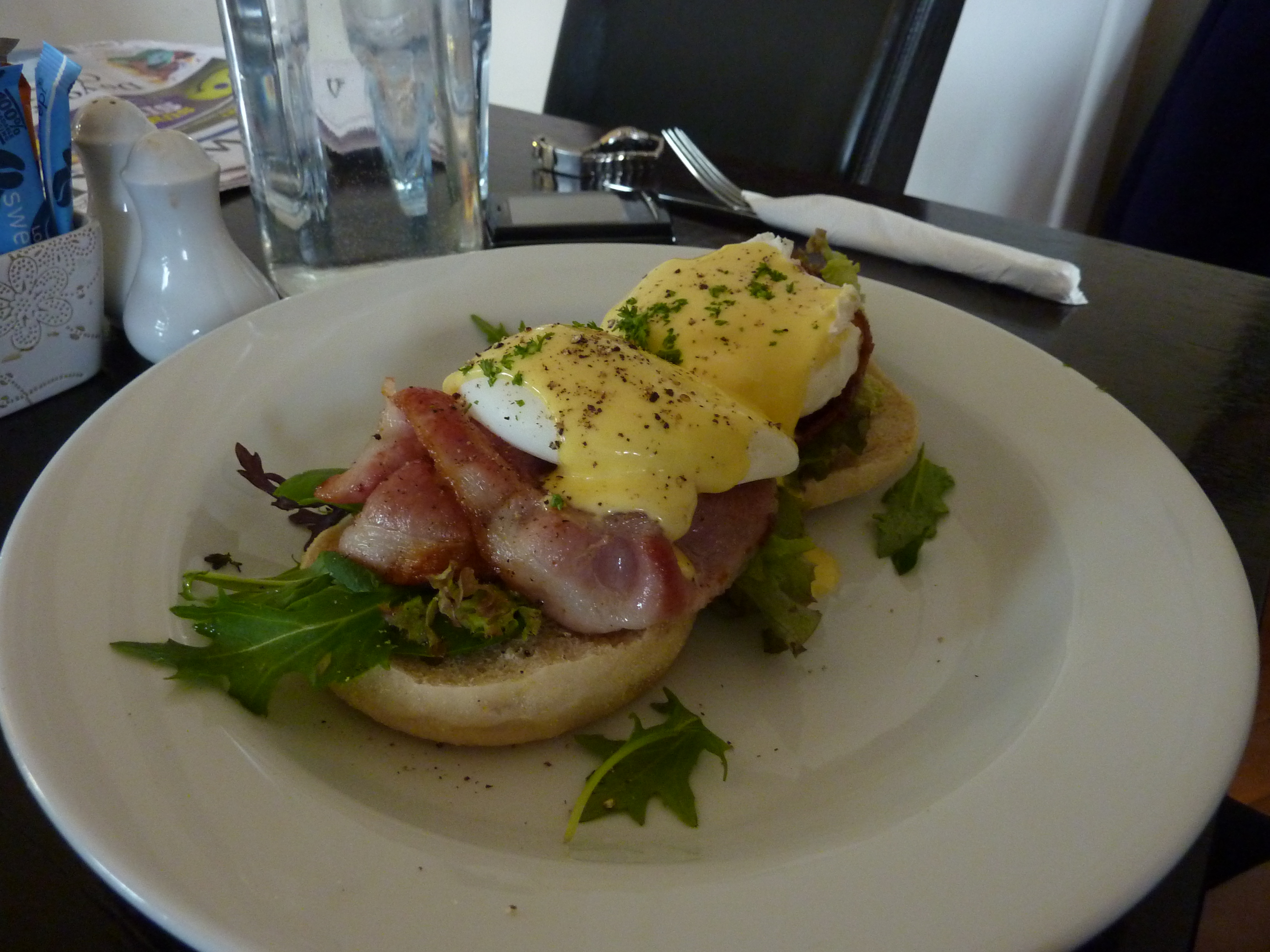 In addition, they were more than willing to be flexible - extra bacon for Nicky and vegetarian for me. Nicky had the eggs benedict - which had mesculin rather spinach and apparently worked really well.